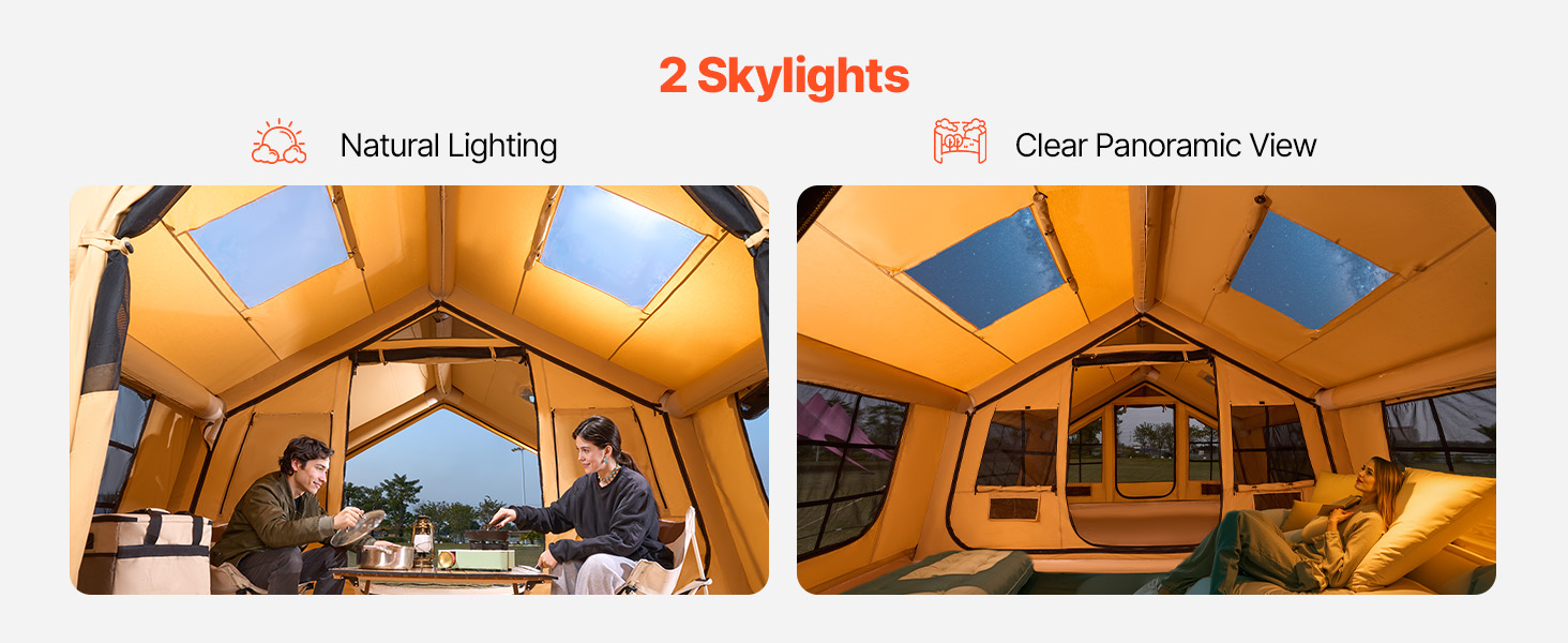 Чудова вентиляція: цей надувний кемпінговий намет обладнаний двома великими світловими люками для панорамного огляду та спостереження за зірками. Просторі головні двері відчиняються повністю, а 4 бічні вікна забезпечують оптимальну циркуляцію повітря. Завдяки сітчастим екранам для захисту від пилу та дверям на блискавці ваш надувний намет залишиться безпечним і комфортним навіть уночі.