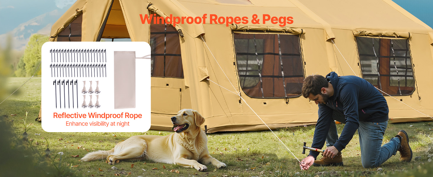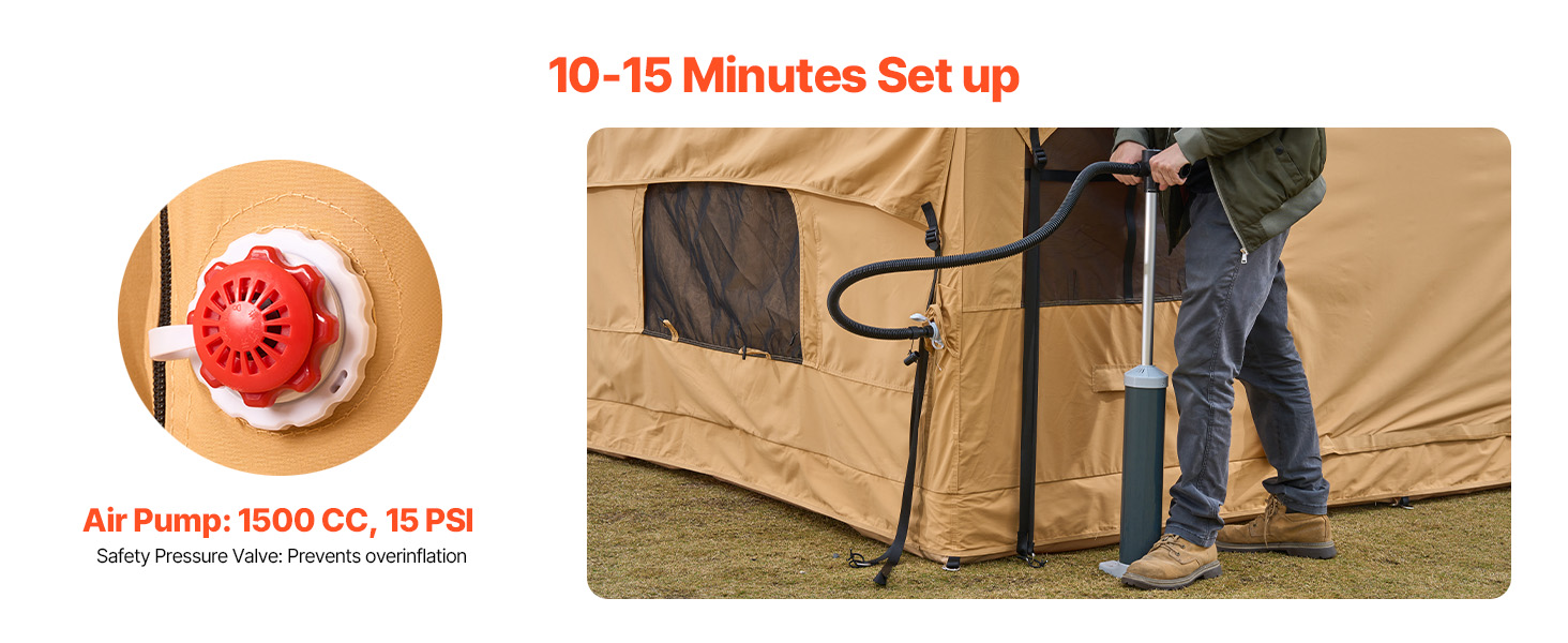 Швидке встановлення за 10-15 хвилин: встановіть надувний кемпінговий намет за допомогою насоса лише за 10-15 хвилин. Насос високого тиску усуває потребу в складеному встановленні рами. Вам не доведеться повторно надувати його впродовж 48 годин, що економить ваш час і сили. Клапан тиску запобігає надмірному надуванню та захищає повітряні колони намету, забезпечуючи тривалий термін експлуатації.