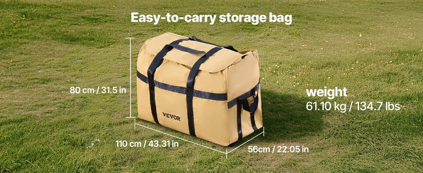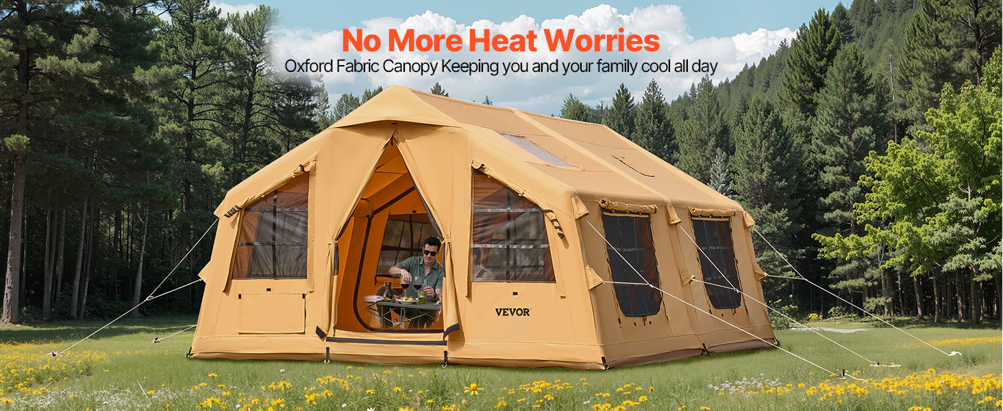 186 квадратних футів. Просторий салон: цей надувний кемпінговий намет площею 186 квадратних футів (15,75 x 11,81 x 7,22 фута/4,8 x 3,6 x 2,2 м) з комфортом вміщує 8–12 осіб. У номері передбачені знімні штори, що дають змогу створити планування з двох спалень або просторої вітальні. Обладнаний роз'ємами для під'єднання плити та змінного струму, він ідеально підходить для цілорічного використання.